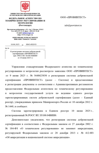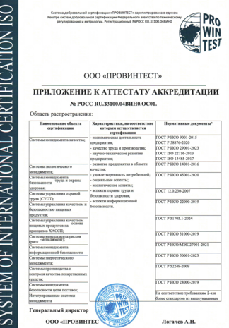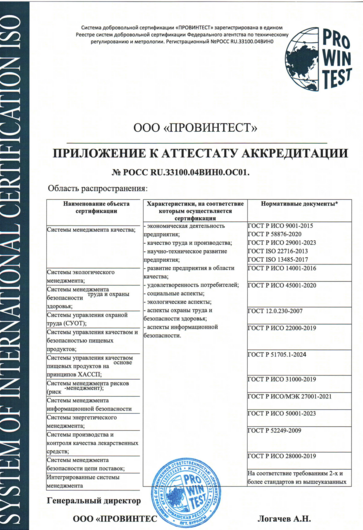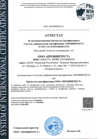 Аттестат аккредитации рег. РОСС RU.З3100.04ВИН0.ОС01 от 10 июня 2025 г . Проверить зарегистрированную систему можно на сайте Федерального агества по техническому регулированнию и метрологии РОССТАНДАРТ.